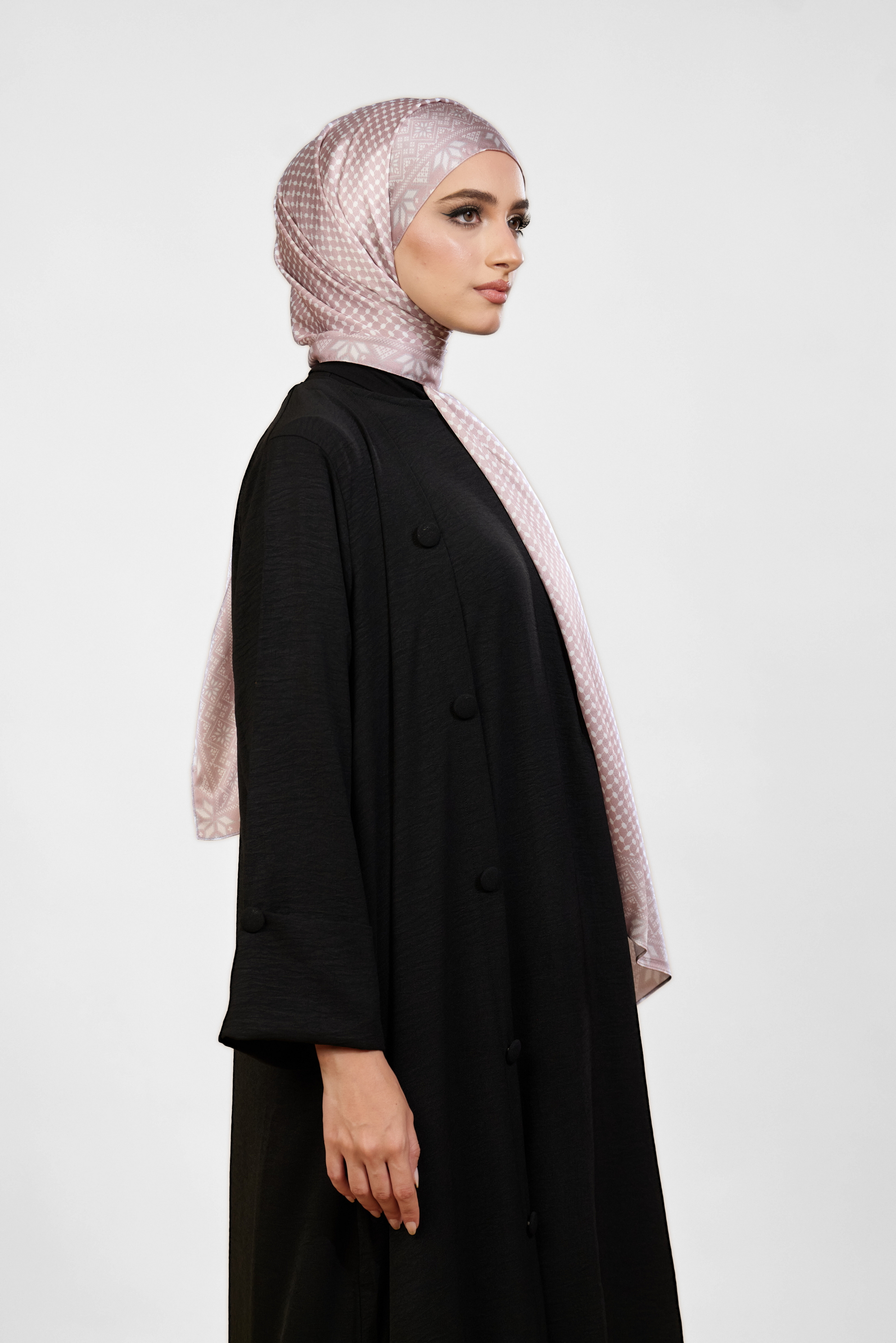 The Tatreez Shawl is made of matte satin that is easy to shape, style and maintain.